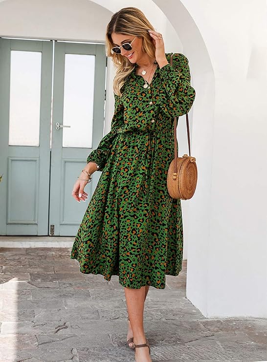 Amazon Com Kirundo 2020 Women S Midi Leopard Dress Stylish Long Sleeves High Waist Dress Button Front Drawstring Wait Belt A Lined Dress Clothing Adult Animated Cartoons Peliculas Animadas